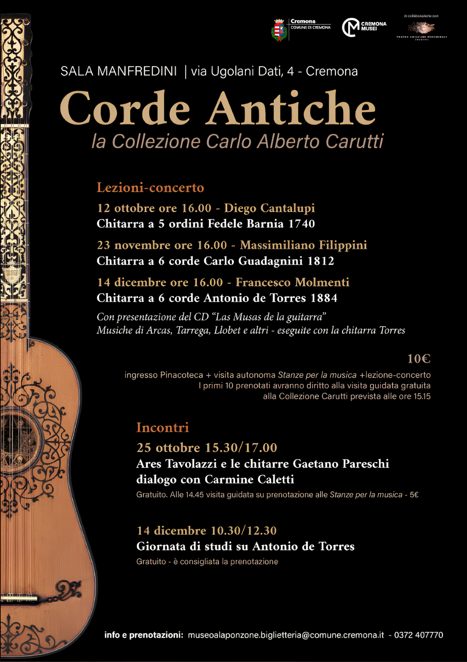 Scopri la collezione Carlo Alberto Carutti, prestigiosa collezione di strumenti antichi, attraverso tre lezioni concerto e due Incontri che si terranno in Sala Manfredini del Museo Civico Ala Ponzone. Un affascinante viaggio storico e sonoro, dalle ultime espressioni della chitarra a cinque cori fino alla nascita della chitarra classica moderna.